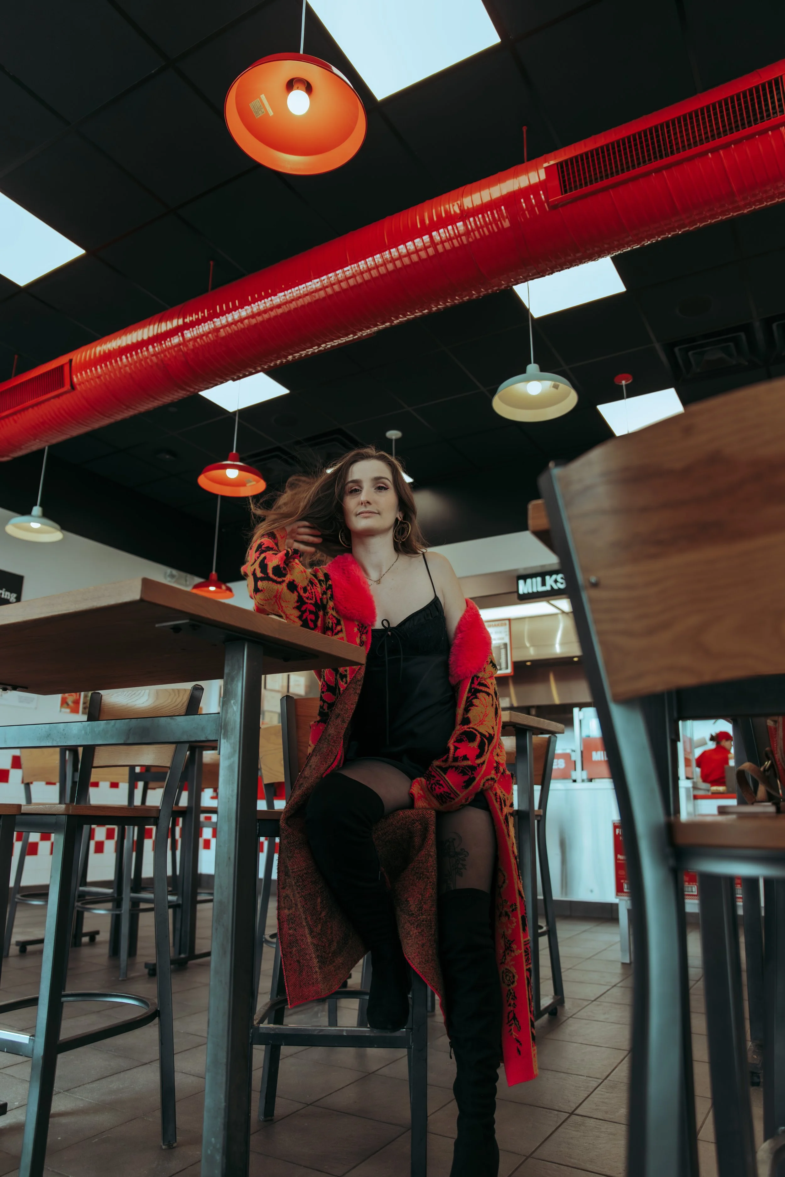 Not every photoshoot needs a dreamy field or a carefully styled studio. Sometimes the most memorable images come from everyday places that feel unexpected. I had a fun idea I wanted brought to life, so I called in my favorite girl for this creative session. We stepped inside a classic burger spot —